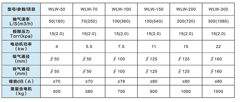 WLW型往復式真空泵的產(chǎn)品性能及規(guī)格參數(shù):